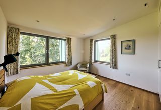 En el interior, las grandes ventanas y habitaciones ofrecen las mejores vistas además de luz. Es este uso de la luz natural lo que hace que la especificación de los rieles de cortina motorizados Silent Gliss SG 5600 sea tan importante. Ello se combina con cortinas Wave en nuestro exclusivo tejido Colorama 1 Multicolor. Con solo pulsar un botón la luz del día se puede filtrar suavemente a través del tejido texturizado para inundar el espacio interior con una luz cálida y difusa. Las cortinas opacas en los perfiles SG 1080 garantizan una noche de sueño tranquilo.