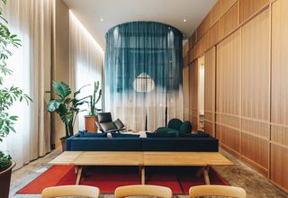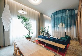 Las habitaciones se caracterizan por la inclusión de un "cilindro" central de tejido translúcido de 4,5m que se eleva hasta el alto techo. El sistema de división de ambientes circular SG 6103 tiene un diámetro de 3,5m y envuelve una cama independiente con un estante y un escritorio integrados. El tejido fino, parcialmente teñido de índigo, está iluminado por una lámpara de papel hecha a medida. En todas las habitaciones, las finas cortinas en los perfiles empotrados SG 6243 crean un ambiente luminoso y brillante con dim-out adicionales para oscurecer la habitación cuando convenga.