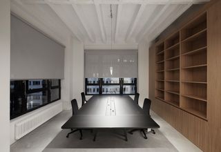 La experiencia en el curvado de rieles de Silent Gliss se exhibe en la sala de reuniones The Octagon. Un riel de cortina manual SG 6243 curvado con precisión, de deslizamiento suave y silencioso con cortinas clásicas define el espacio.