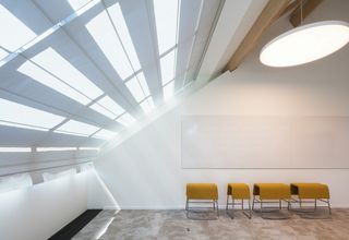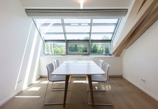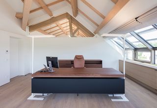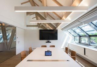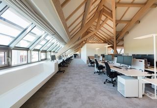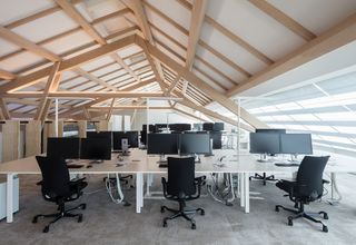 El piso superior alberga el mundo de oficinas del "nuevo trabajo": oficinas individuales flexibles junto con oficinas de planta abierta finamente estructuradas. La llamativa construcción de madera de haya se viste con más de 60 sistemas de tragaluces motorizados, que abarcan toda la estructura. La capa de aluminio del tejido Aluscreen Futura garantiza altos valores de reflectancia solar para regular la temperatura de la habitación y ofrece una excelente protección solar interior para los puestos de trabajo, todo operado con solo tocar un botón.