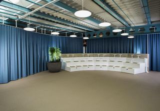 El espacio de trabajo se ha separado del área de eventos, tanto visual como acústicamente, con el sistema motorizado SG 5600. El uso de cortinas Wave proporciona un ambiente relajado. También se han instalado sistemas de separación de ambientes SG 6100.